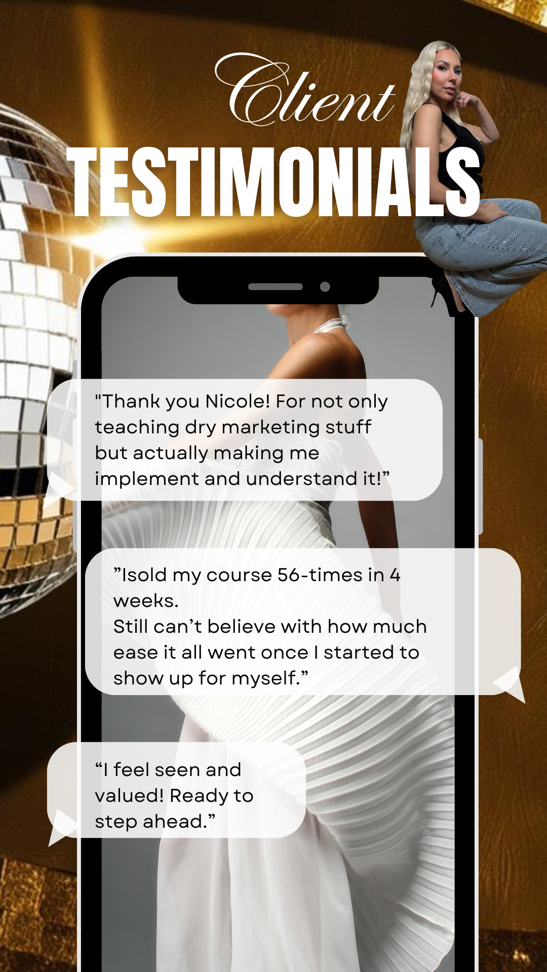 After your sign-up you will receive a link with a calendar to book your 1:1 Onboarding Call with Nicole. In the Onboarding Call we will discover and map out your unique plan to your 6- or 7-figure Female Empire that matches your business or business idea.